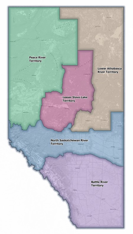 Image is a map from the Otipemisiwak Métis Government showing the 5 different Territories of the Métis Nation within Alberta, which cover the entire extent of the Province of Alberta: