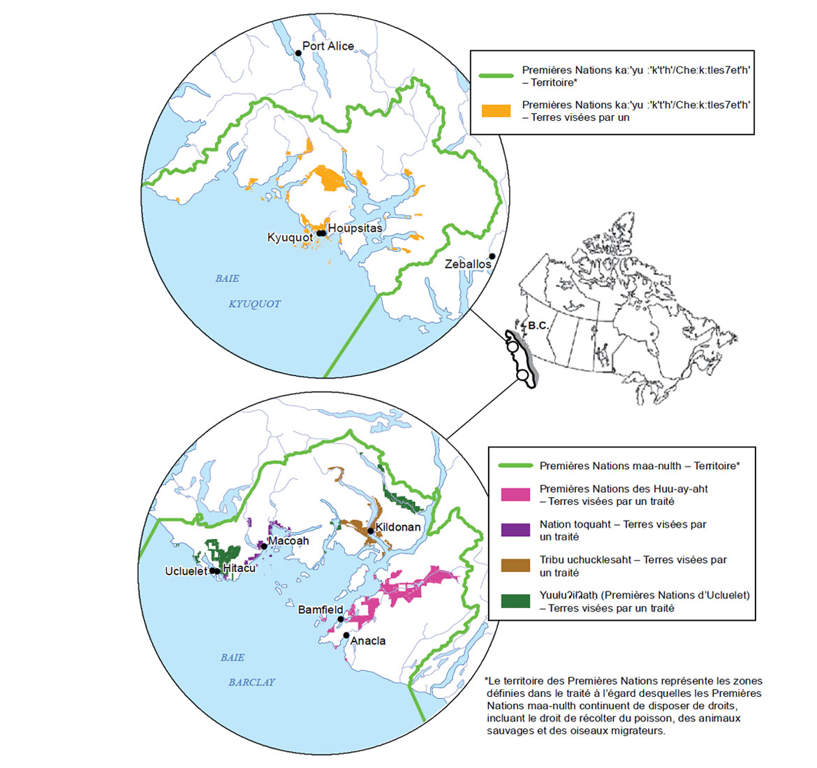L'image inférieure identifie le territoire et les terres ajoutées par un traité pour les Premières Nations Huu-ay-aht, la Nation Toquaht, la tribu Uchucklesaht et Yuulu? Il? Ath (Premières Nations Ucluelet).