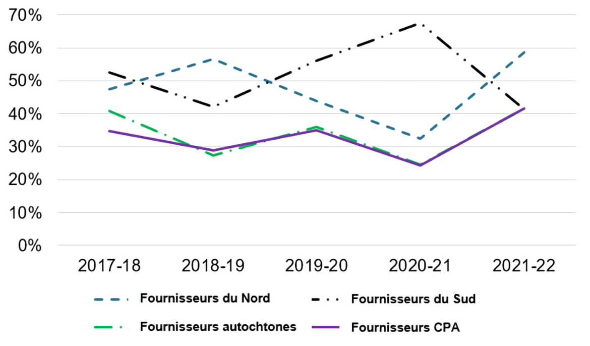 L'équipe du projet effectue également un suivi des fournisseurs par type, en particulier les fournisseurs du Nord, les fournisseurs autochtones et les fournisseurs visés par les considérations liées aux possibilités pour les Autochtones. De 2021 à 2022, les achats auprès des fournisseurs nordiques et autochtones ont connu une augmentation significative par rapport aux années précédentes. La proportion de l'argent dépensé en contrats pour le Nord a atteint 59 % des dépenses totales (environ 43 millions de dollars). La proportion dépensée auprès des fournisseurs autochtones et des fournisseurs visés par les considérations liées aux possibilités pour les Autochtones est passée à 41 % (30 millions de dollars pour chaque sous-catégorie). Les achats auprès des fournisseurs du Sud ont diminué à 41 % (30 millions de dollars).
