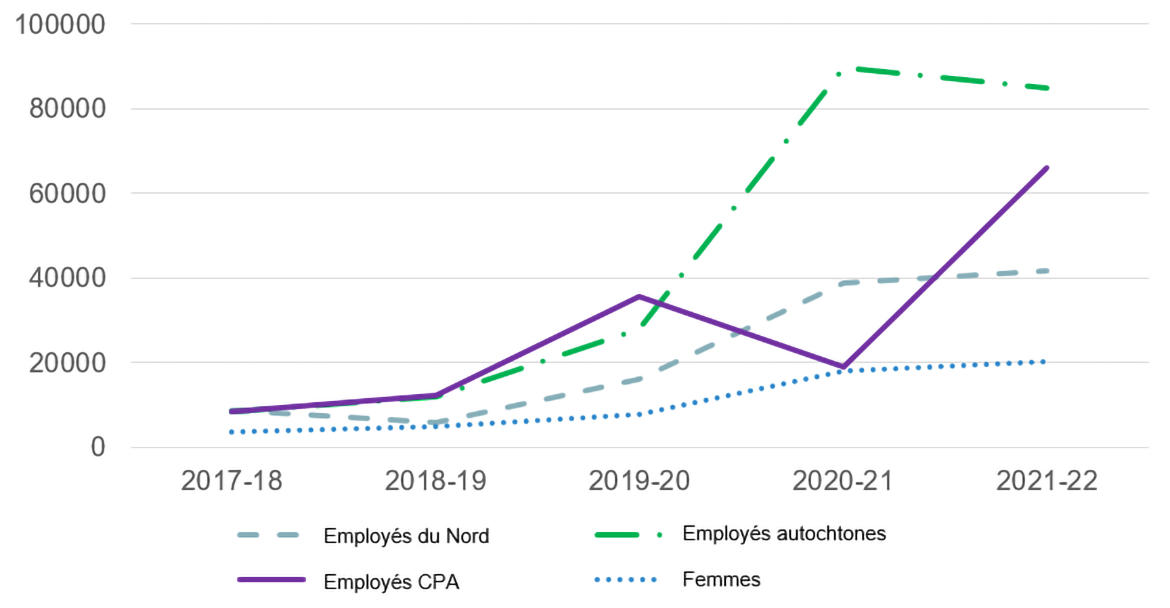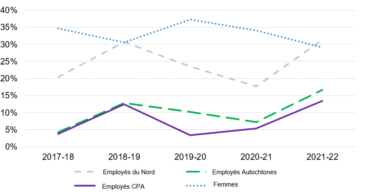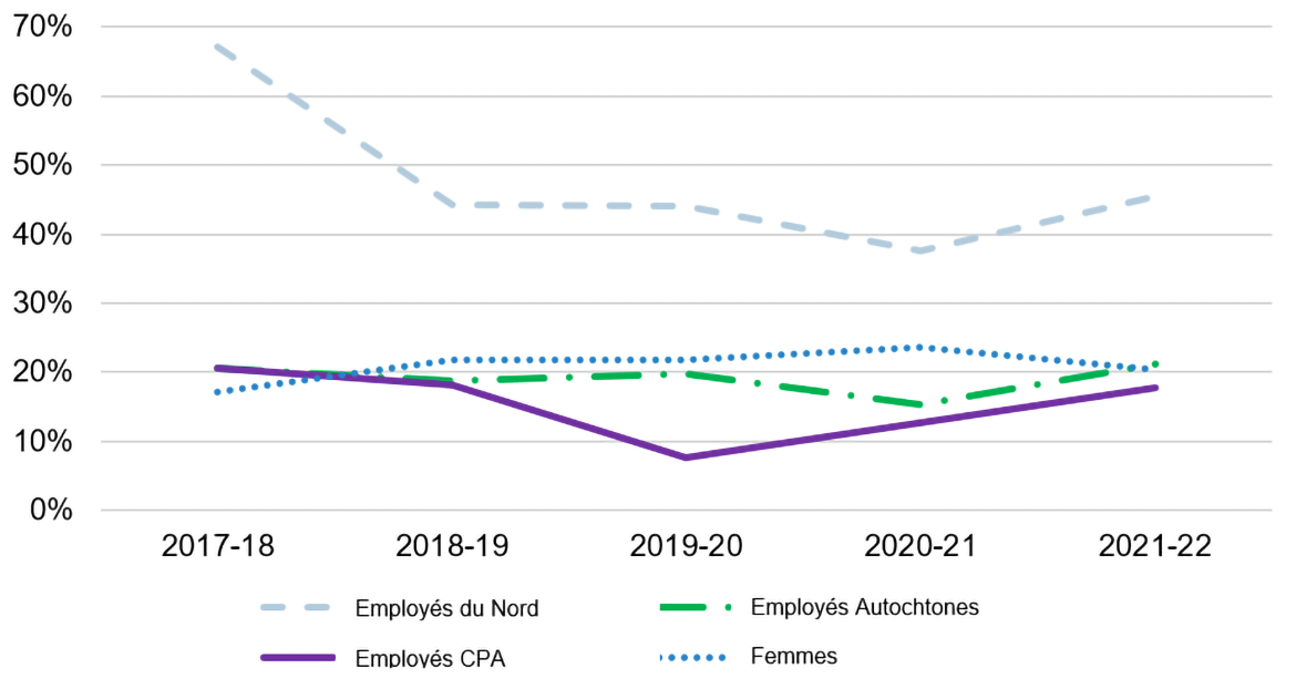 Le nombre total d'heures travaillées a augmenté dans toutes les catégories d'emploi. L'emploi dans le Nord est passé de 38 % à 46 % pour la période de 2021 à 2022. L'emploi de travailleurs autochtones a est passé de 15 % à 21 %, tandis que l'emploi de travailleurs visés par les considérations liées aux possibilités pour les Autochtones a augmenté par rapport aux années précédentes, passant de 13 % à 18 %. Dans l'ensemble, le nombre d'heures travaillées par les employées a augmenté de 2021 à 2022; cependant, par rapport au nombre total d'heures travaillées dans le projet, le pourcentage d'heures travaillées a légèrement diminué par rapport à l'année précédente, passant de 24 % à 20 %.