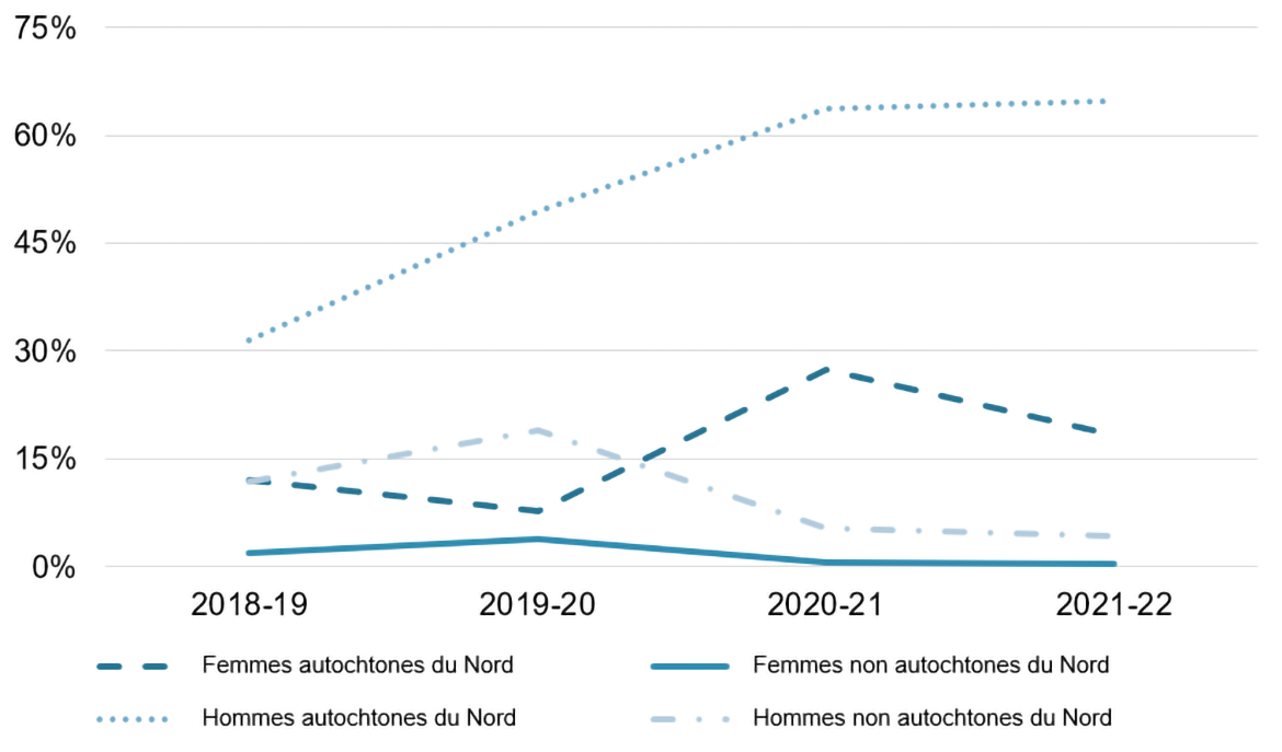 - Figure 14 : Pourcentage non normalisé des heures personnes formées par sous catégorie du Nord (données de Parsons et de RCAANC, 2018-2019 à 2021-2022)
