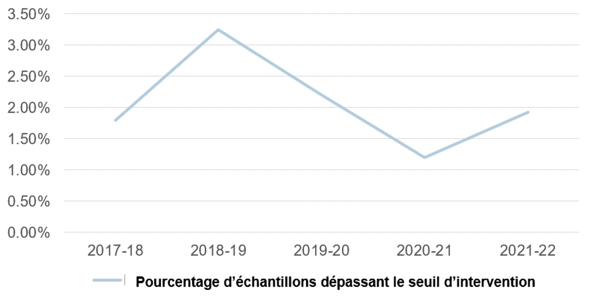 - Figure 6 : Pourcentage d'échantillons dépassant le seuil d'intervention (35 µg/L) de 2017-2018 à 2021 2022