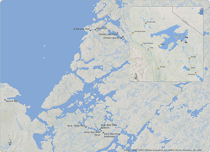 - Cinq (5) sites sur la rive de la rivière Camsell (au sud-est du Grand lac de l'Ours) où l'on a exploité de l'argent, du cuivre et du bismuth de 1969 à 1985.