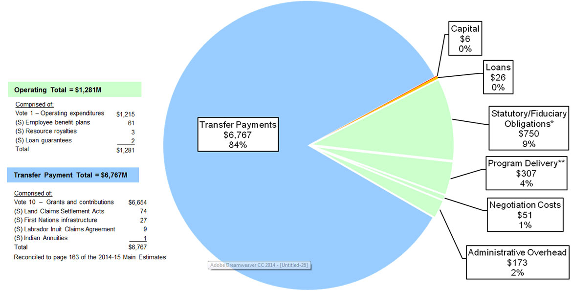 AANDC is responsible for the majority of federal programs and services that support Aboriginal people and Northerners. According to the 2014-2015 Main Estimates, tabled in Parliament on February 27,2014, AANDC will spend approximately $8.1 billion (see chart below). Of this, approximately 84 per cent goes directly to recipients through transfer payments. Much of this funding ensures that Aboriginal people have access to basic services comparable to those provided to other Canadians through provincial, municipal and territorial governments. These services include education, housing, community infrastructure (water and sewage systems), social support services, and other benefits. In addition to expenditures for basic services, the department promotes economic development, negotiates and oversees the implementation of comprehensive and specific claim settlements, and implements practical forms of self-government.