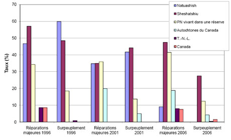 - Chiffres pour les Premières nations des réserves tirées de Canada, Santé Canada, Profil statistique sur la santé des Premières nations au Canada, 2003 et les chiffres sur les communautés innues du Labrador, obtenus par une extraction des données du Newfoundland and Labrador Centre for Health Information, février 2009. (retourner au paragraphe source)