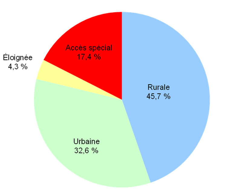 Ce diagramme circulaire illustre la répartition de la population selon le pourcentage de la population dans les réserves par zone géographique. La répartition est la suivante : rurale, 45,7 %; urbaine, 32,6 %; accès spécial, 17,4 %; éloignée, 4,3 %.