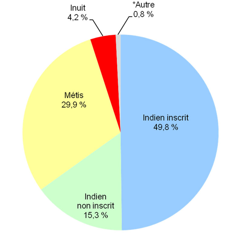 « Autres » renvoie aux personnes ayant déclaré appartenir à plus d'un groupe autochtone et à celles ayant affirmé être membres d'une bande, sans identité autochtone et sans statut d'Indien inscrit.