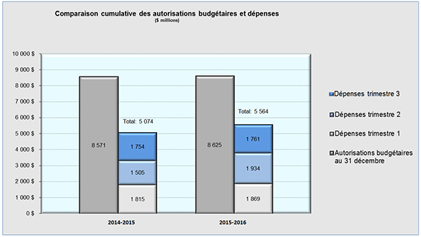 Les données de l'exercice 2014-2015 indiquent que les autorisations budgétaires du Budget principal des dépenses, Budget supplémentaire des dépenses (A) et ajustements des affectations tels que les reports d'autorisations à un exercice ultérieur totalisent à la fin du trimestre 3 en 2014-15 8 571 millions de dollars et qu'ils totalisent 8 625 millions de dollars à la fin du trimestre 3 en 2015-16.