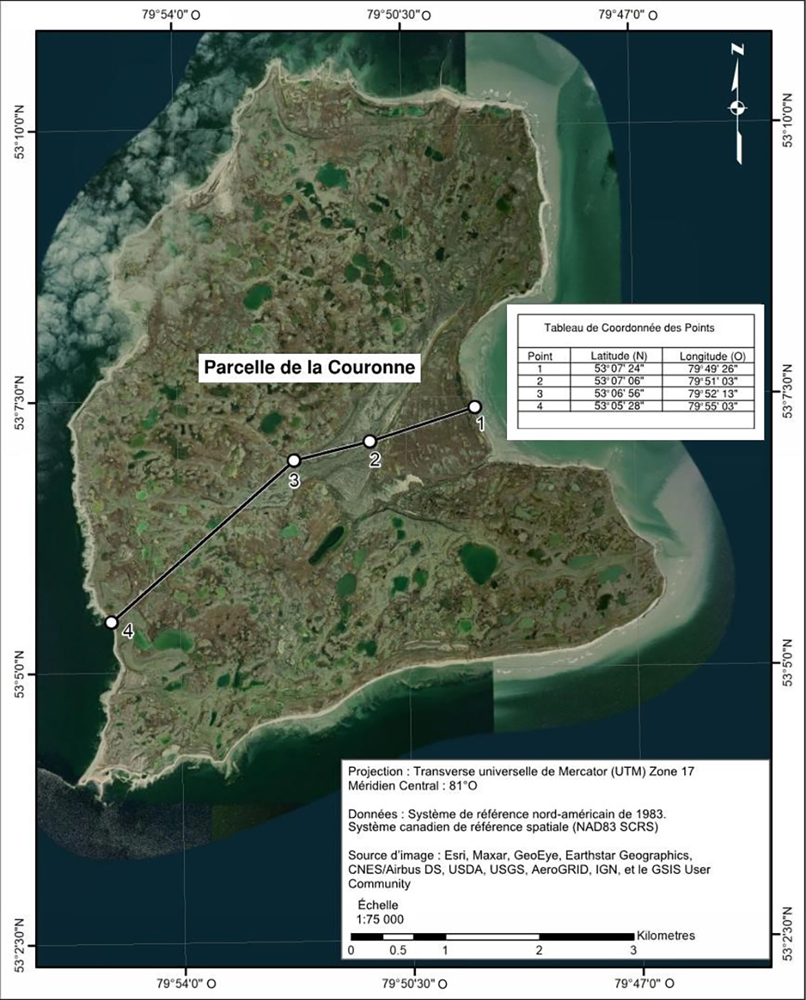 En conformité avec la présente entente, l'Entente relative à la région extracôtière de chevauchement Cris/Inuit, jointe à l'annexe 30-1, et la région du Nunavut, comme le définit l'Accord sur les revendications territoriales du Nunavut, la zone des Cris dans la RME, illustrée à l'annexe 5-1A, comprend toutes les zones marines, les îles, les terres, l'eau et l'eau de mer située dans les limites suivantes :