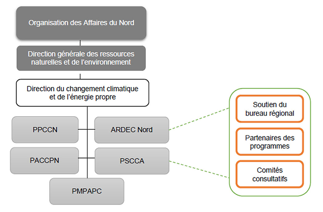 La Direction du changement climatique et de l'énergie propre (DCCEP) relève de l'Organisation des affaires du Nord (OAN) et est gérée par la Direction de l'environnement et des ressources naturelles. La DCCEP soutient la planification et la mise en œuvre de mesures d'adaptation et d'atténuation dans les communautés autochtones et nordiques et supervise directement les programmes qui relèvent de RCAANC (PACCPN, PSCCA, PPCCN).