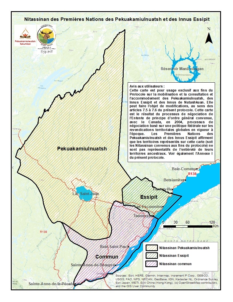 « Cette carte est destinée exclusivement aux fins du Protocole sur la mobilisation et la consultation et l'accommodement des Pekuakamiulnuastsh, des Innus Essipit et des Innus Nutashkuan. Elle peut faire l'objet de modifications, au sens des articles 7.5 à 7.6 du présent protocole. Cette carte est le résultat du processus de négociation de l'Entente de principe de nature générale convenue avec le Canada en 2004, un processus de négociation fondé sur la politique fédérale sur les revendications territoriales globales en vigueur à l'époque. Les Premières Nations des Pekuakamiulnuatsh et Essipit affirment que les territoires représentés sur cette carte (c'est-à-dire le Nitassinan convenu aux fins du protocole) ne sont pas représentatifs de l'ensemble de leurs territoires ancestraux. Voir également l'Annexe I du présent protocole. »