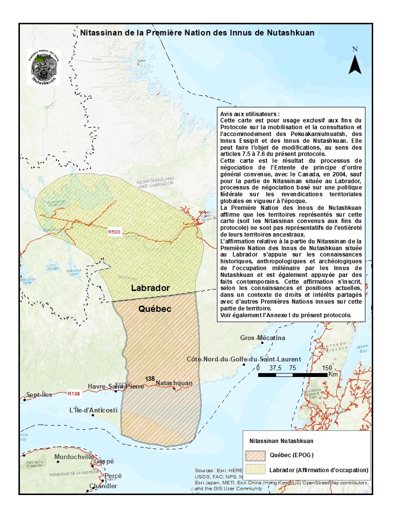 « Cette carte est destinée exclusivement aux fins du Protocole sur la mobilisation et la consultation et l'accommodement des Pekuakamiulnuastsh, des Innus Essipit et des Innus Nutashkuan. Elle peut faire l'objet de modifications, au sens des articles 7.5 à 7.6 du présent protocole. Cette carte est le résultat du processus de négociation de l'Entente de principe de nature générale convenue avec le Canada en 2004, sauf pour la partie de Nitassinan située au Labrador, un processus de négociation fondé sur la politique fédérale sur les revendications territoriales globales en vigueur à l'époque. La Première Nation des Innus de Nutashkuan affirme que les territoires représentés sur cet carte (c'est-à-dire le Nitassinan convenu aux fins du protocole) ne sont pas représentatifs de l'entièreté de leurs territoires ancestraux. L'affirmation relative à la partie du Nitassinan de la Première Nation des Innus de Nutashkuan située au Labrador repose sur les connaissances historiques, anthropologiques et archéologiques relatives à l'occupation millénaire par les Nutashkuan Innus, ainsi que sur des faits contemporains. Cette revendication est formulée selon les connaissances et les positions actuelles, dans un contexte de droits et d'intérêts partagés avec d'autres Premières Nations innues sur cette partie du territoire. Voir aussi l'Annexe I du présent protocole. »